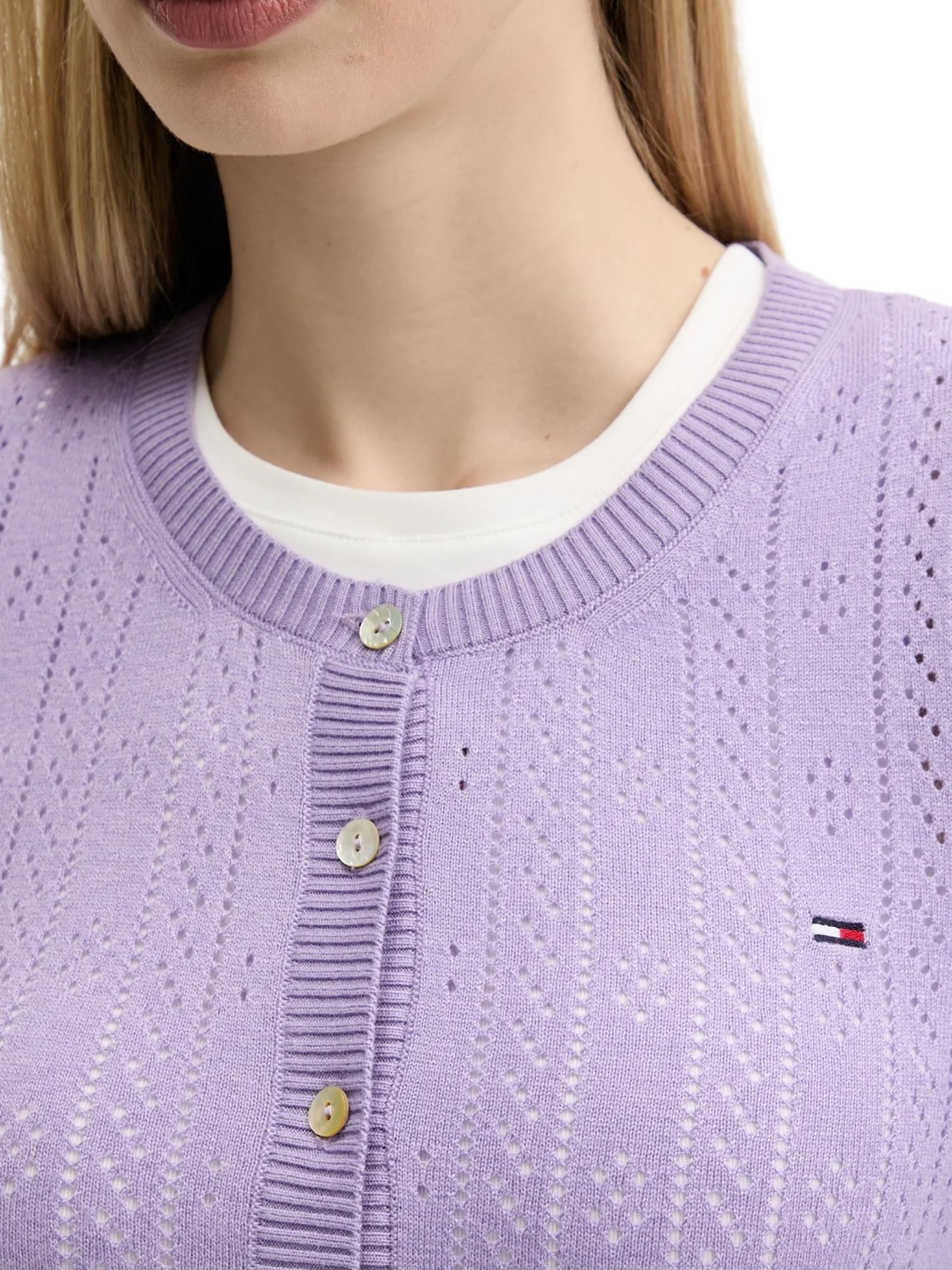Cardigan girocollo traforato Tommy jeans lilla. Logo sul petto. Materiale elasticizzato con composizione: 50% Viscosa, 28% Poliestere, 22% Poliammide