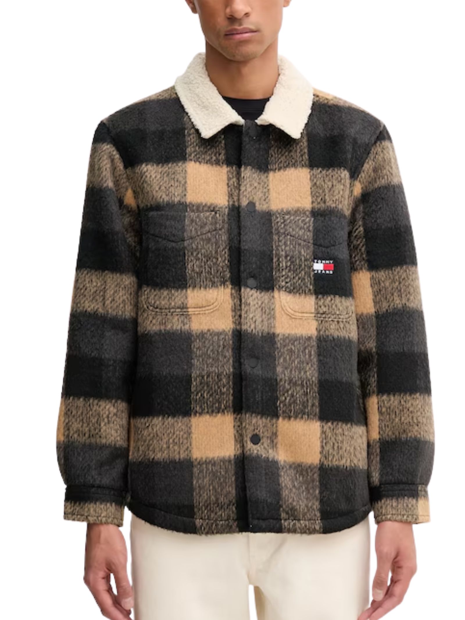 Camicia giacca Tommy Jeans a quadri nero/giallo con dettagli teddy in materiale a fantasia transizionale con interno leggermente imbottito per maggiore comfort termico. Vestibilità ampia per libertà di movimento, collo morbido e spalle abbassate. Chiusura e polsini con bottoni a scatto, due tasche laterali e due tasche sul petto. Logo ricamato sul davanti.