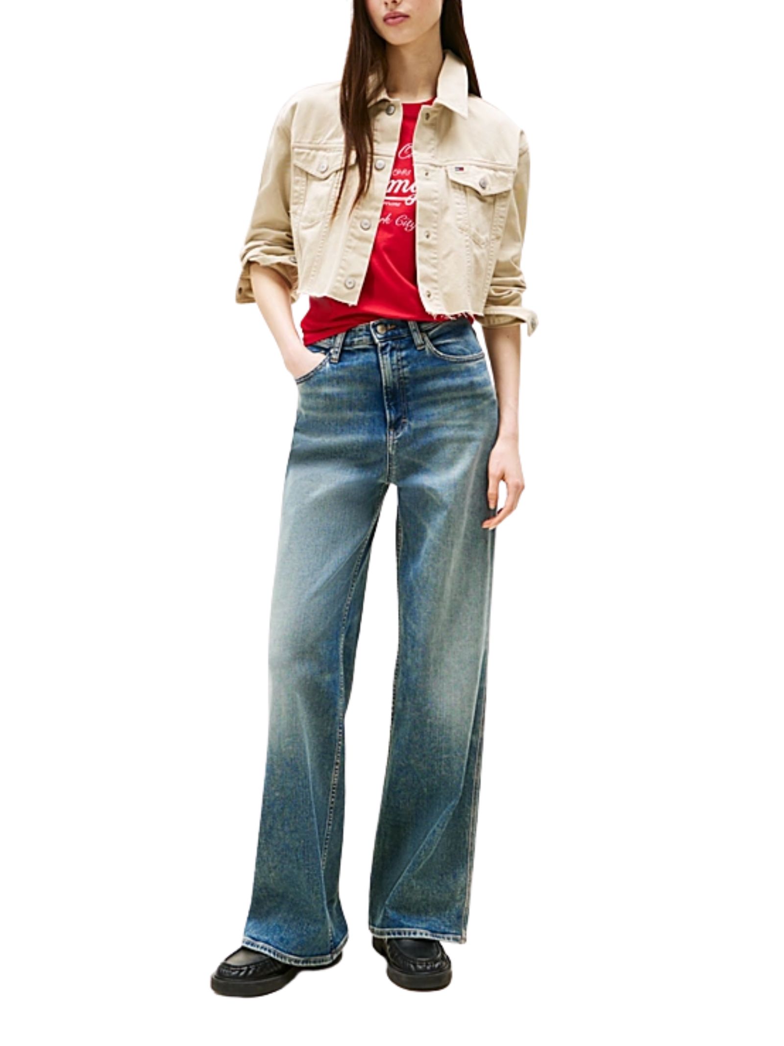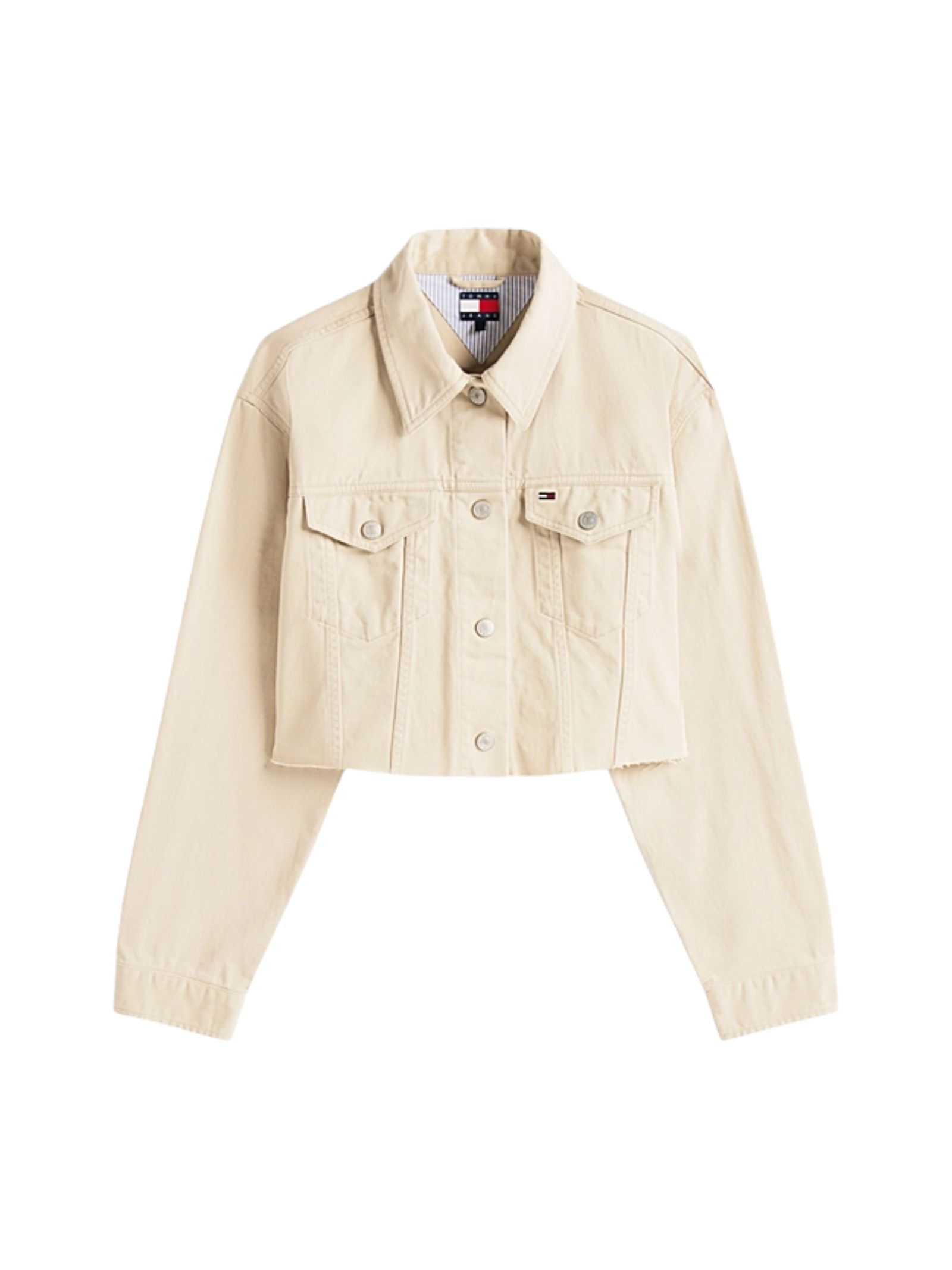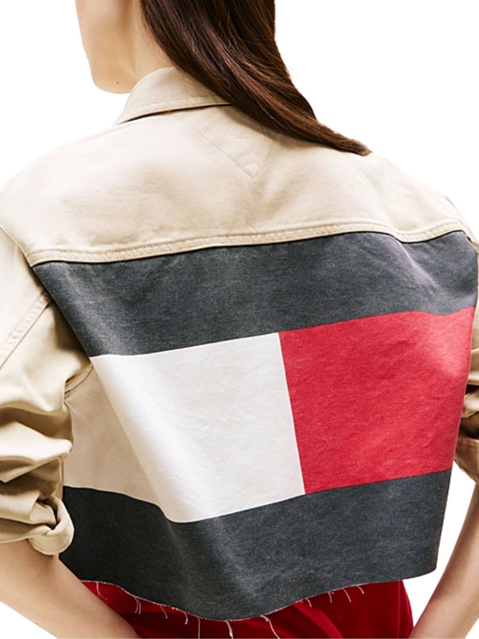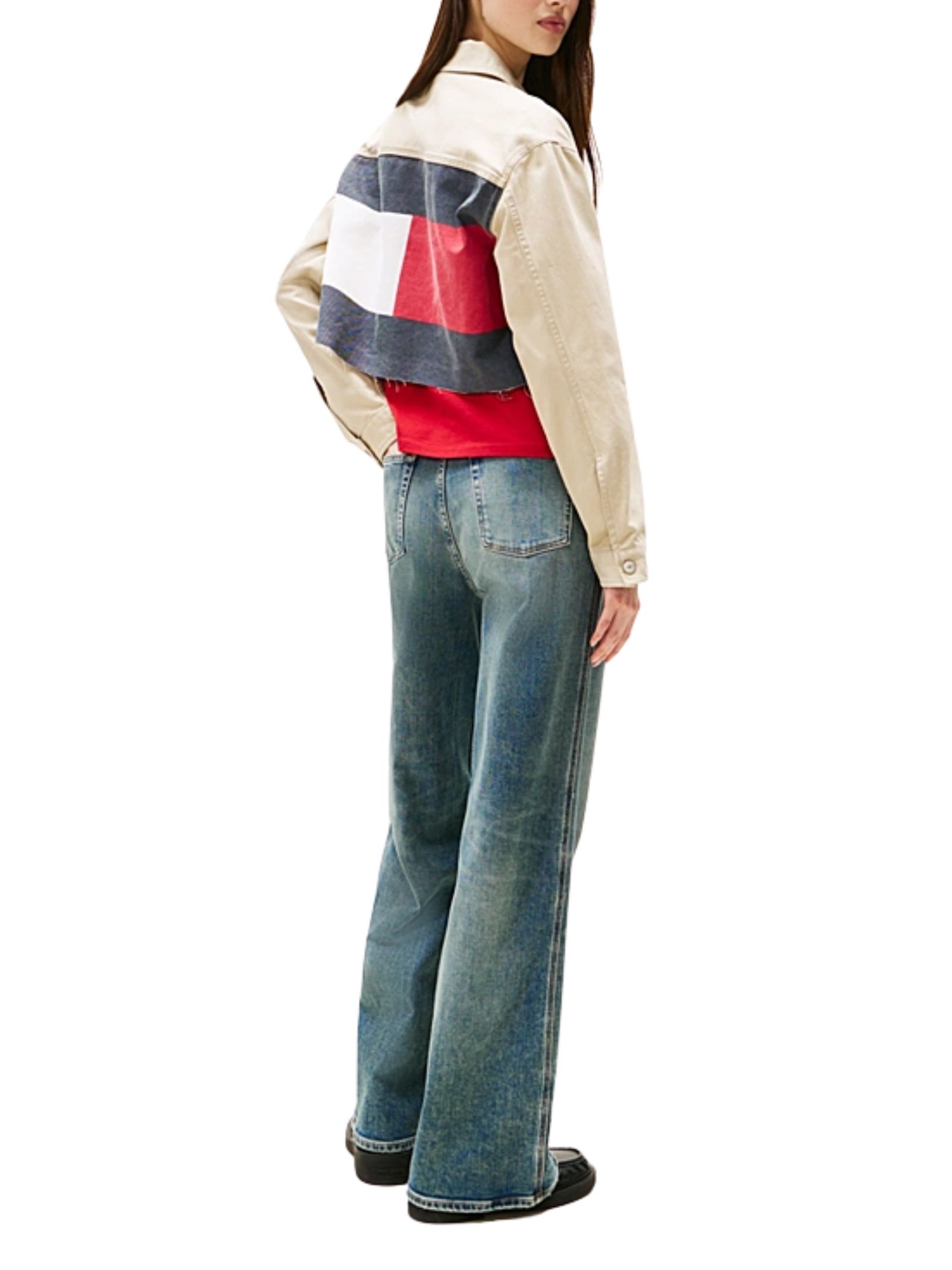La giacca corta in denim con l'iconica bandiera Tommy Jeans sul retro dona ai tuoi look un tocco grintoso e di tendenza. Realizzata in denim rigido al 100% cotone, presenta un colletto semifrancese, chiusura con bottoni automatici, due tasche con bottone sul petto, branding Tommy Jeans e la bandierina ricamata sul petto. Il fit è squadrato e cropped, con spalle scese per un look moderno e rilassato.
