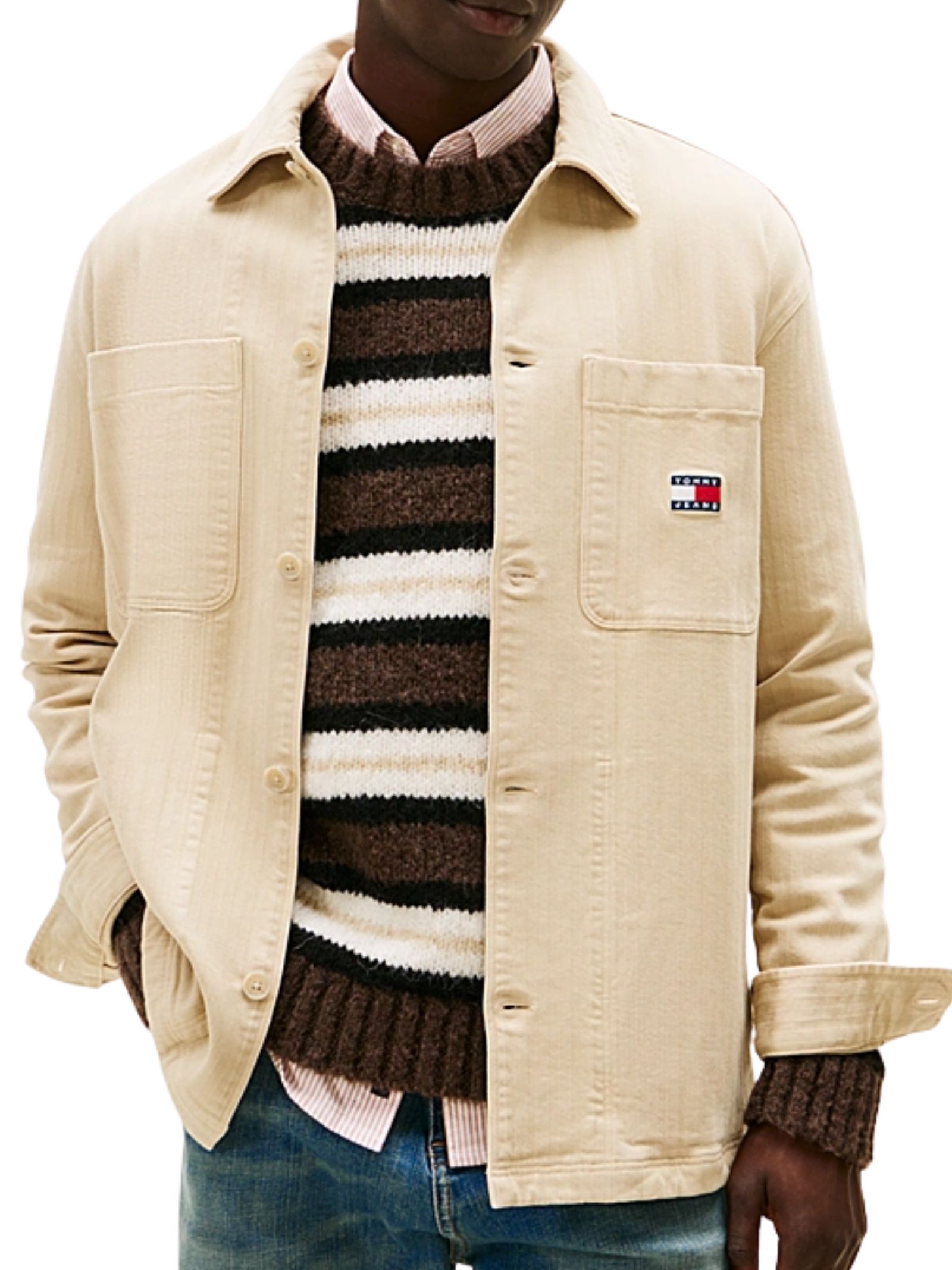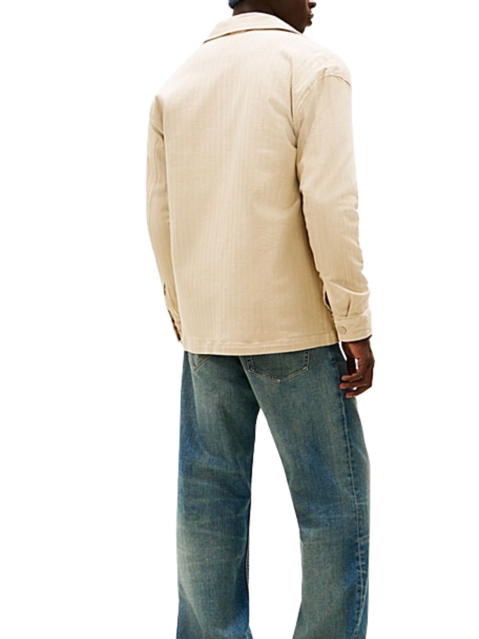 Giacca camicia Tommy Jeans in twill di cotone stretch con trama a spina di pesce, colletto semifrancese, due tasche applicate sul petto con distintivo Tommy su una di esse, polsini con bottone e branding Tommy Jeans, caratterizzata da oversize fit con spalle leggermente scese per un look comodo e moderno. Composizione: 99% cotone, 1% elastan.