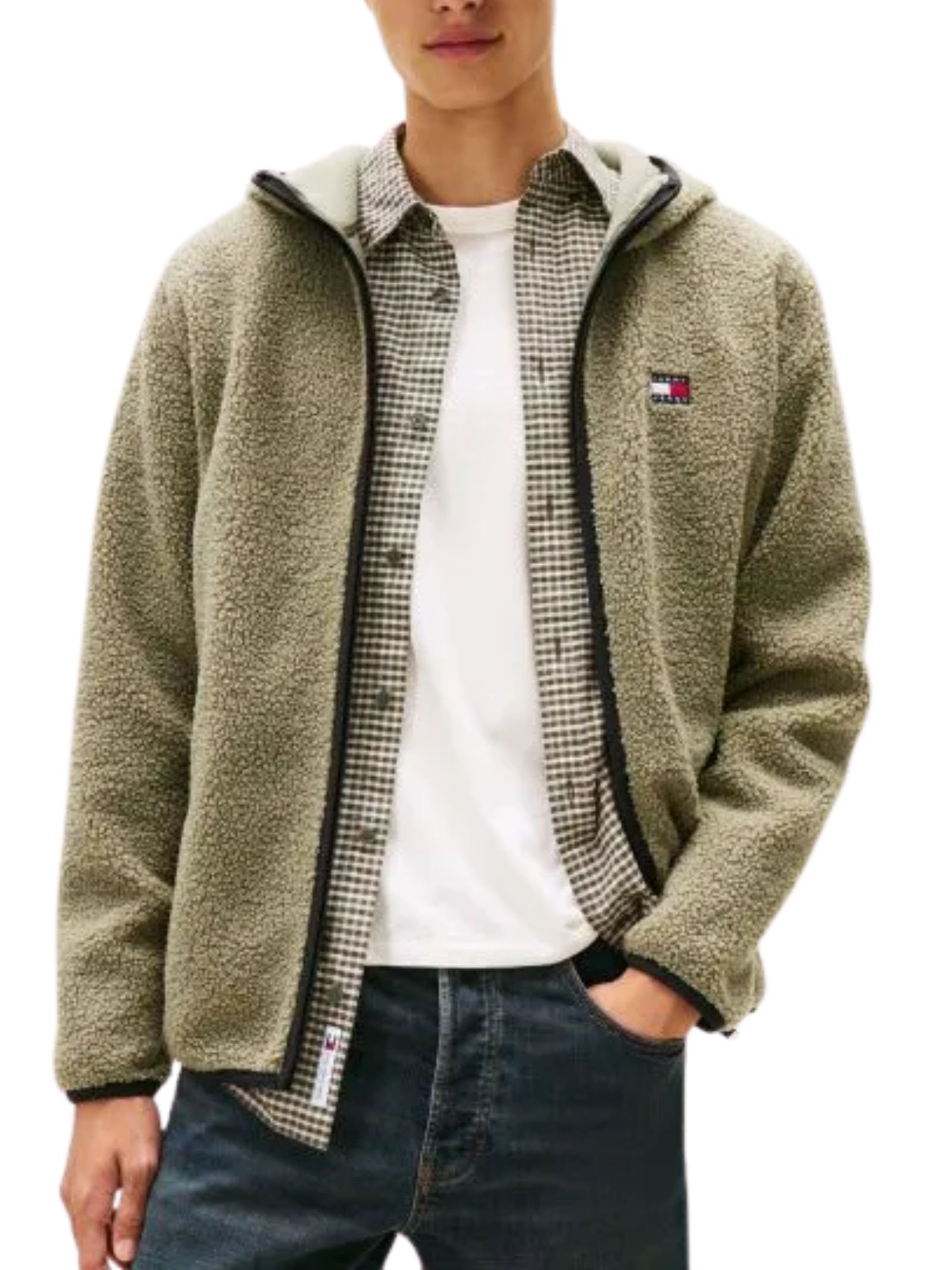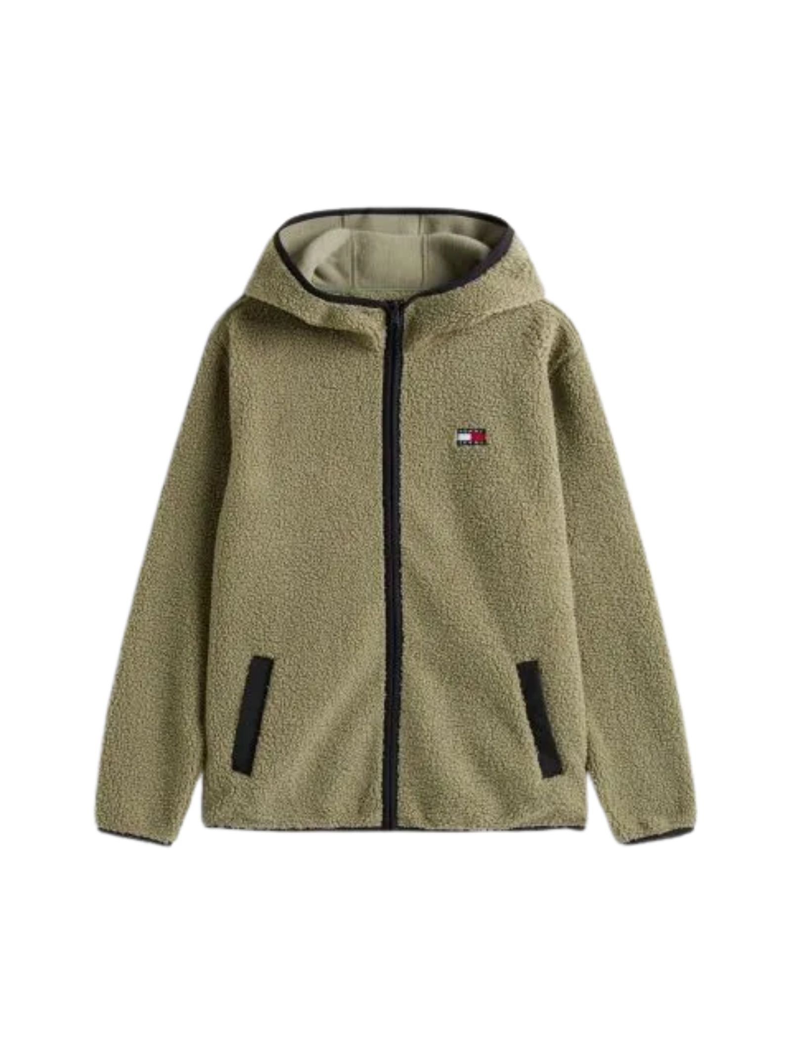 Felpa/Giacca verde con cappuccio e zip realizzata in morbido pile teddy, ideale per mantenerti al caldo, rifinita con bordi a contrasto e arricchita da uno stemma ricamato sul petto. Presenta cappuccio, chiusura zip-through, due tasche anteriori a filetto e dettagli del marchio Tommy Jeans. Composizione: 100% poliestere.