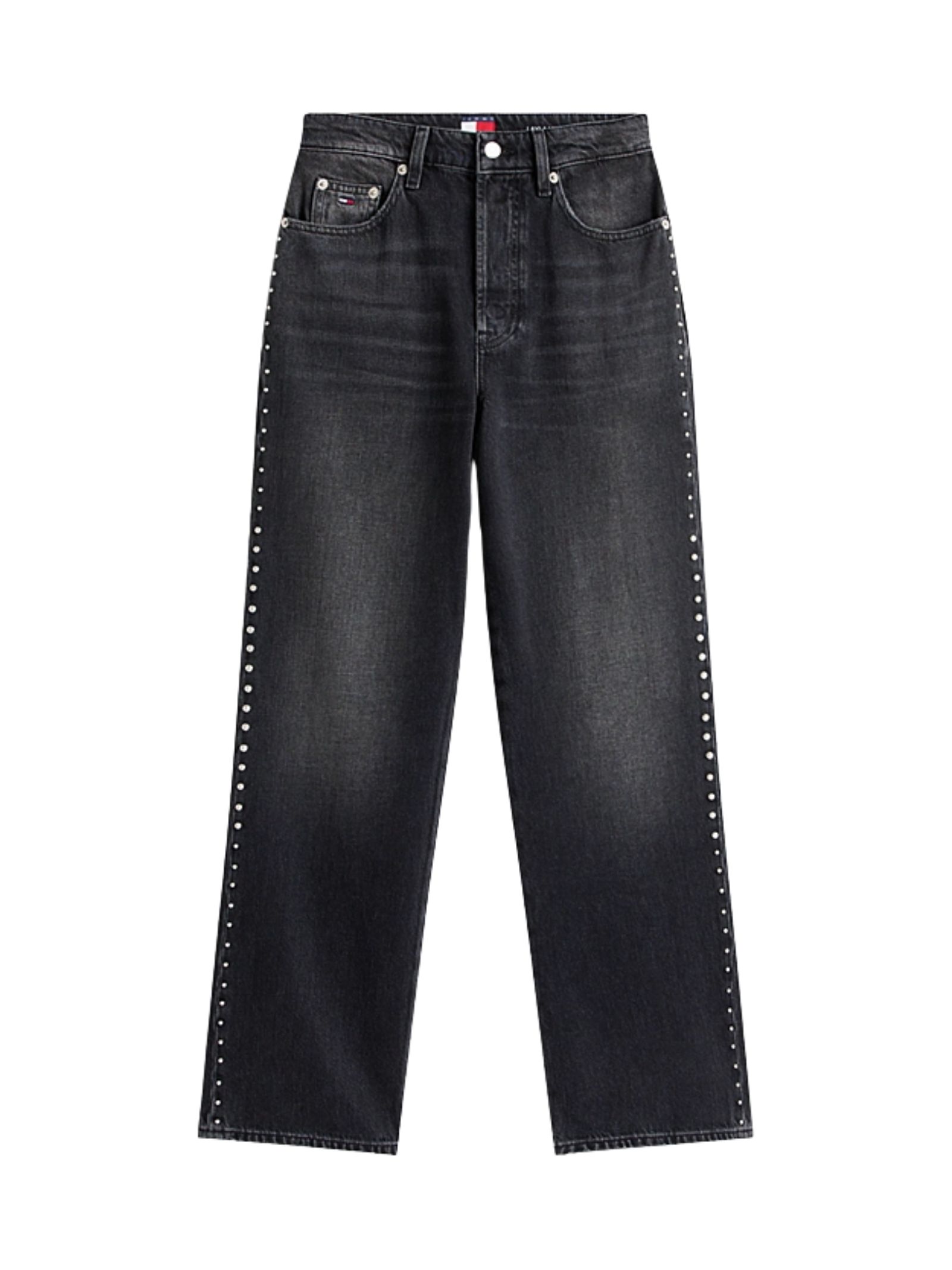 Jeans neri a vita alta dal taglio dritto, impreziositi da borchie e particolari scoloriture che donano originalità, realizzati in denim rigido sovratinto con baffature sulle cosce, modello cinque tasche e branding Tommy Jeans con bandierina ricamata sul taschino portamonete e sulla tasca posteriore, in 100% cotone.