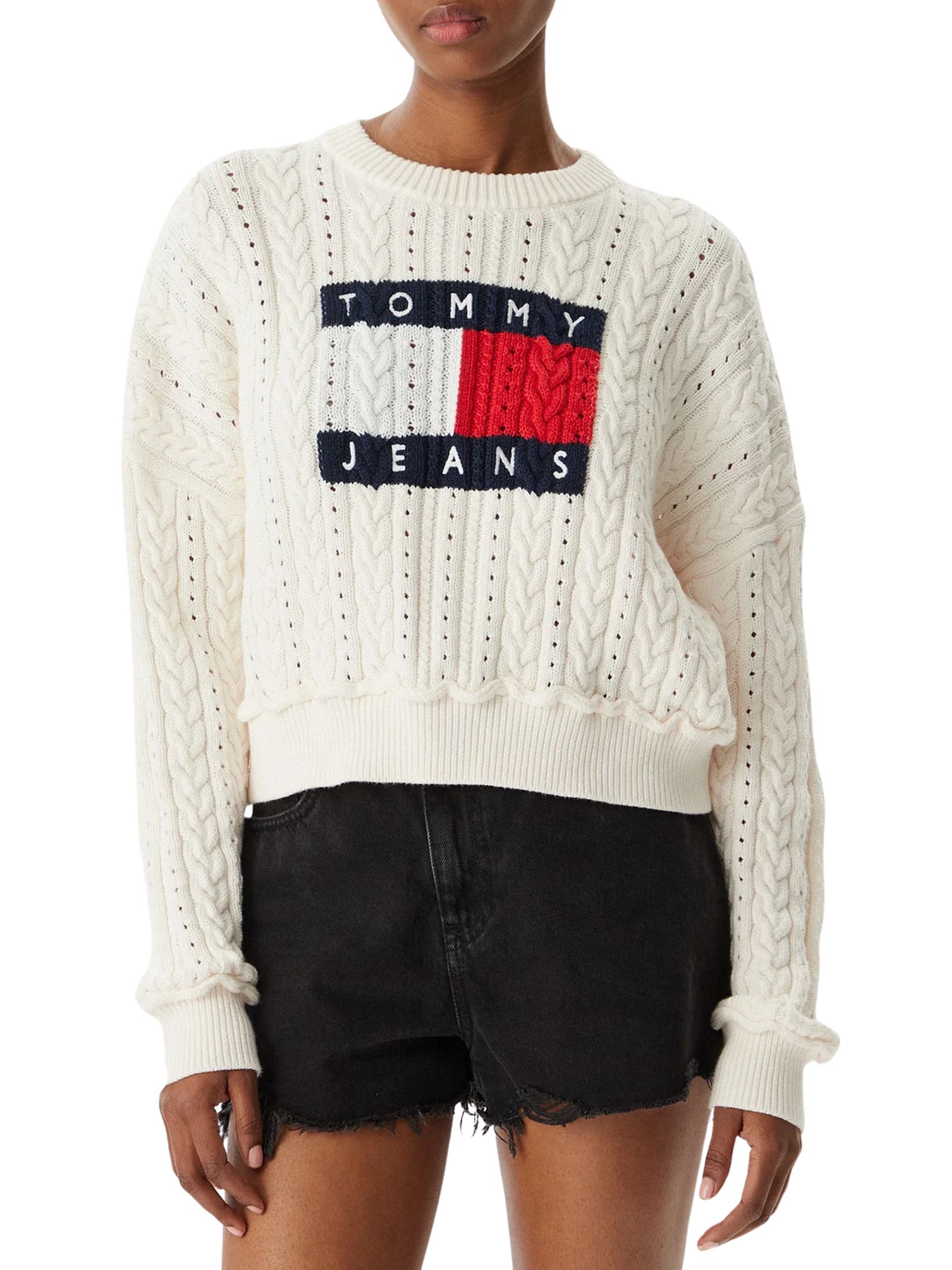 Maglione a trecce con logo dal design traforato, che dona un tocco di leggerezza e traspirabilità, stampa classica brand Tommy Jeans e vestibilità regular per un comfort quotidiano senza rinunciare allo stile, lunghezza classica, ideale per comletare look freschi ed estivi. Composizione: 100% cotone.