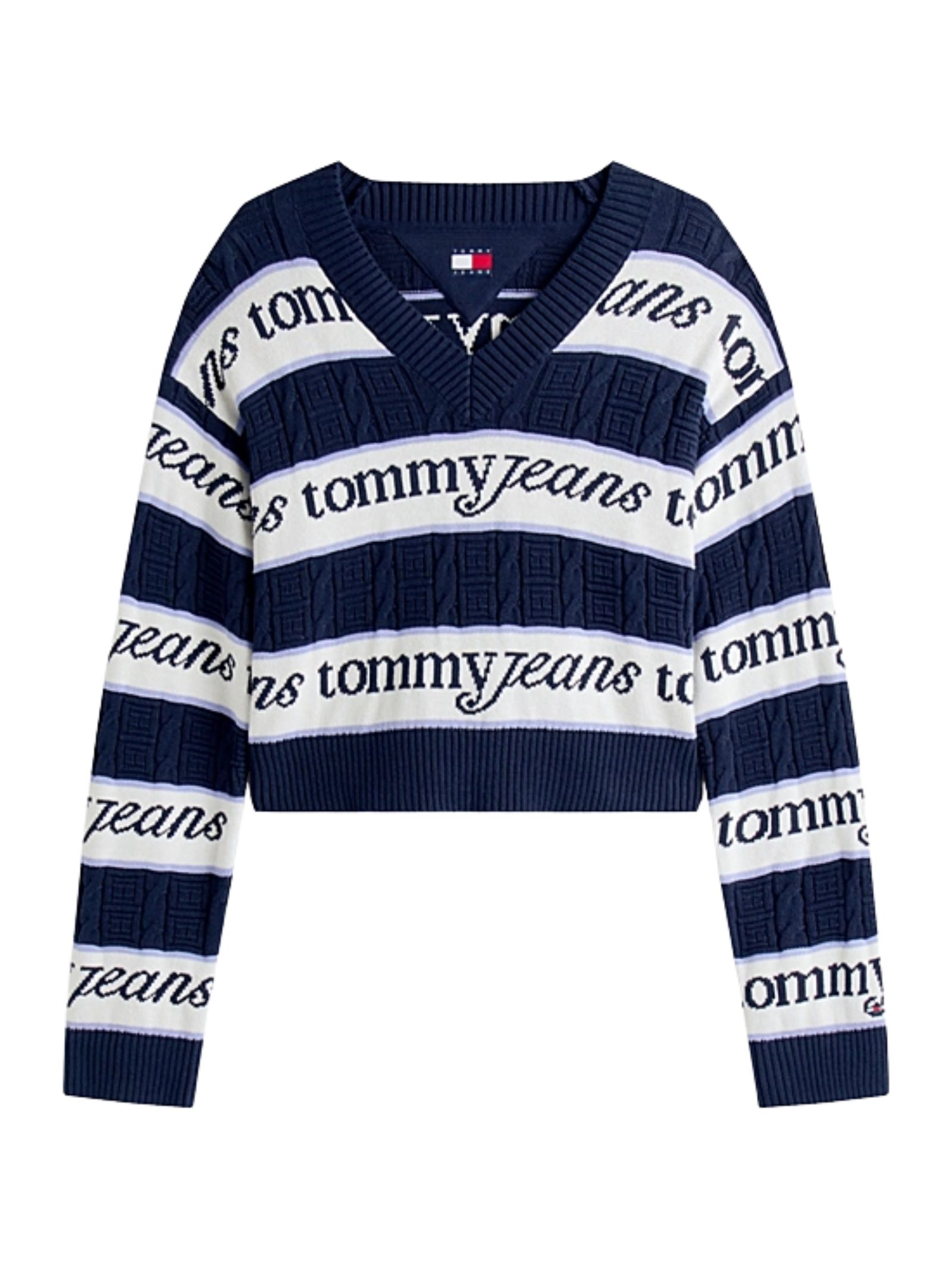 Pullover blu Tommy Jeans in maglia intrecciata in puro cotone pettinato, con fantasia a righe e logo Tommy serif all over. Presenta scollatura a V, collo, polsini e fondo a coste, bandierina ricamata sulla manica e branding. Vestibilità relaxed con spalle leggermente scese. Composizione: 100% cotone.