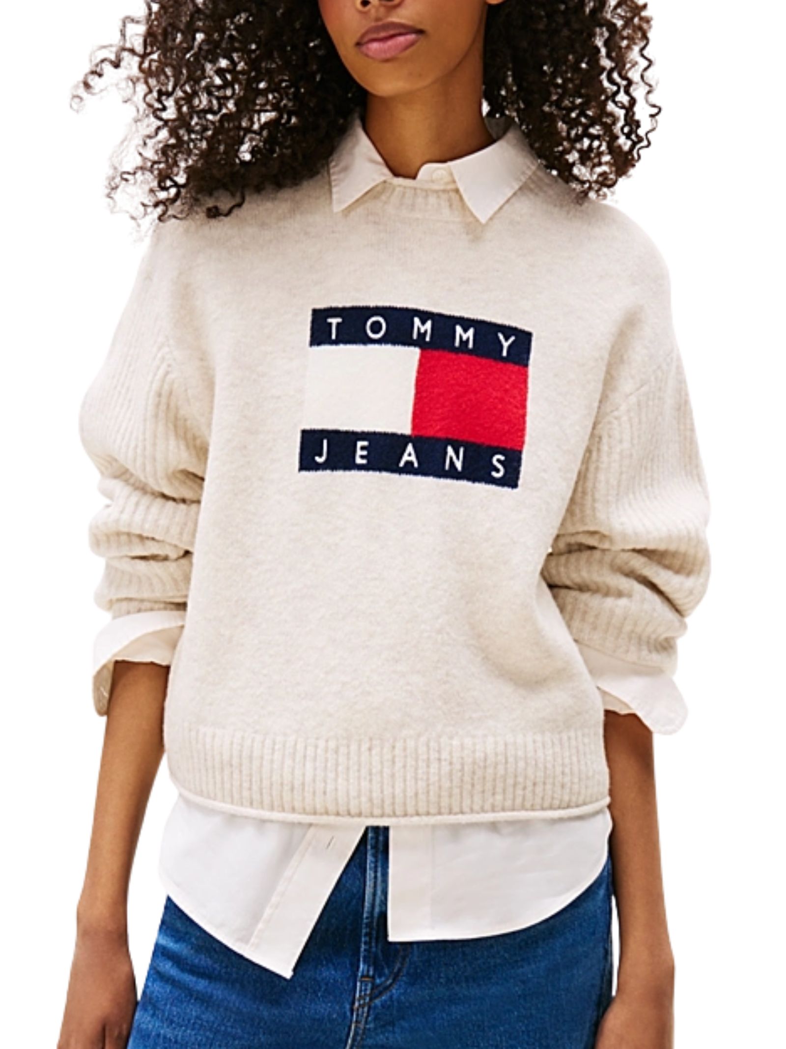 Pullover bianco mélange in misto lana stretch dal taglio morbido, con scollatura rotonda, maglia a coste su collo, maniche e fondo, distintivo con bandiera Tommy sul davanti e branding Tommy Jeans; relaxed fit con spalle scese; composto da 70% acrilico, 23% nylon, 5% lana e 2% elastan.