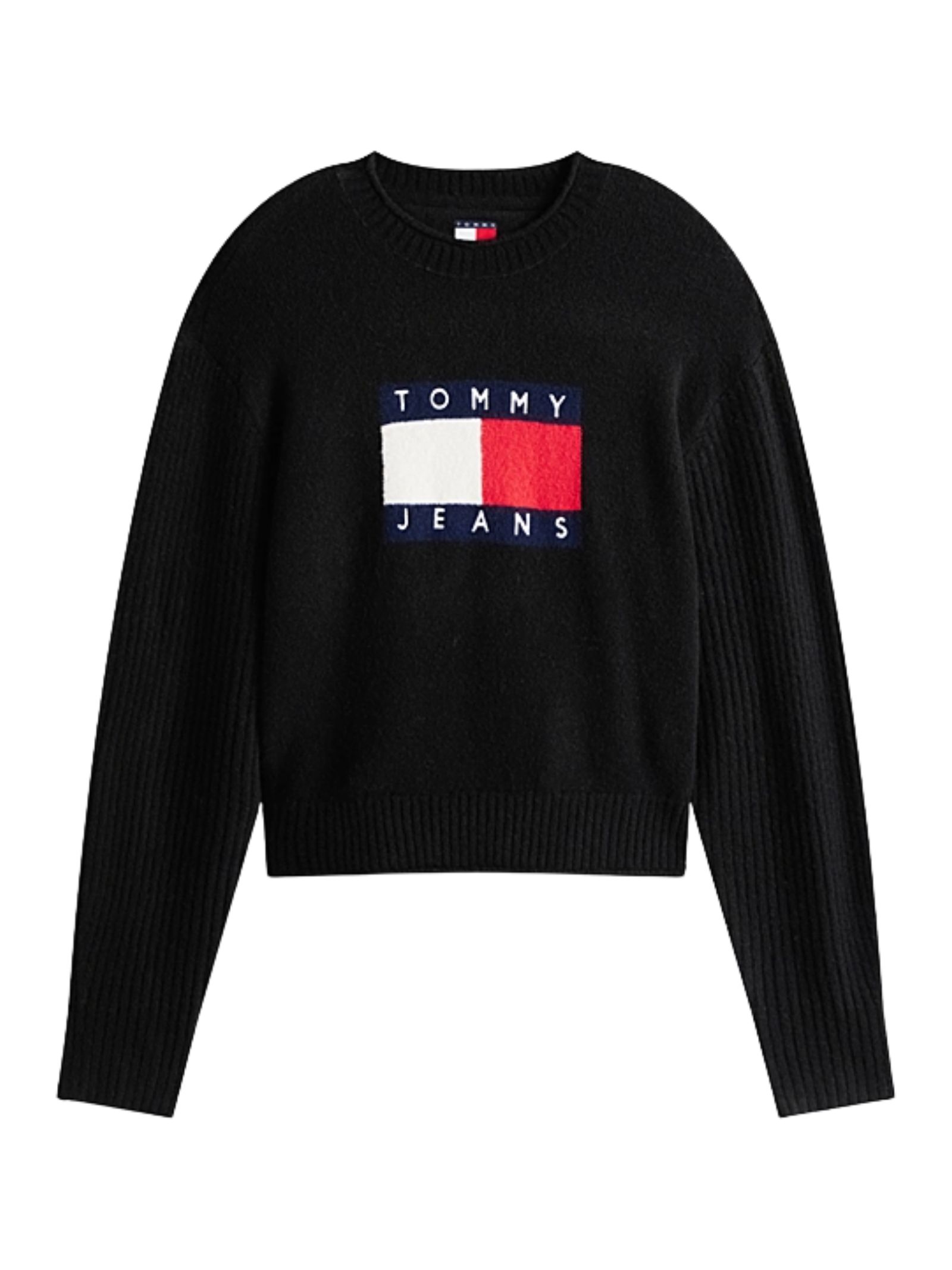 Pullover nero mélange in misto lana stretch dal taglio morbido, con scollatura rotonda, maglia a coste su collo, maniche e fondo, distintivo con bandiera Tommy sul davanti e branding Tommy Jeans; relaxed fit con spalle scese; composto da 70% acrilico, 23% nylon, 5% lana e 2% elastan.