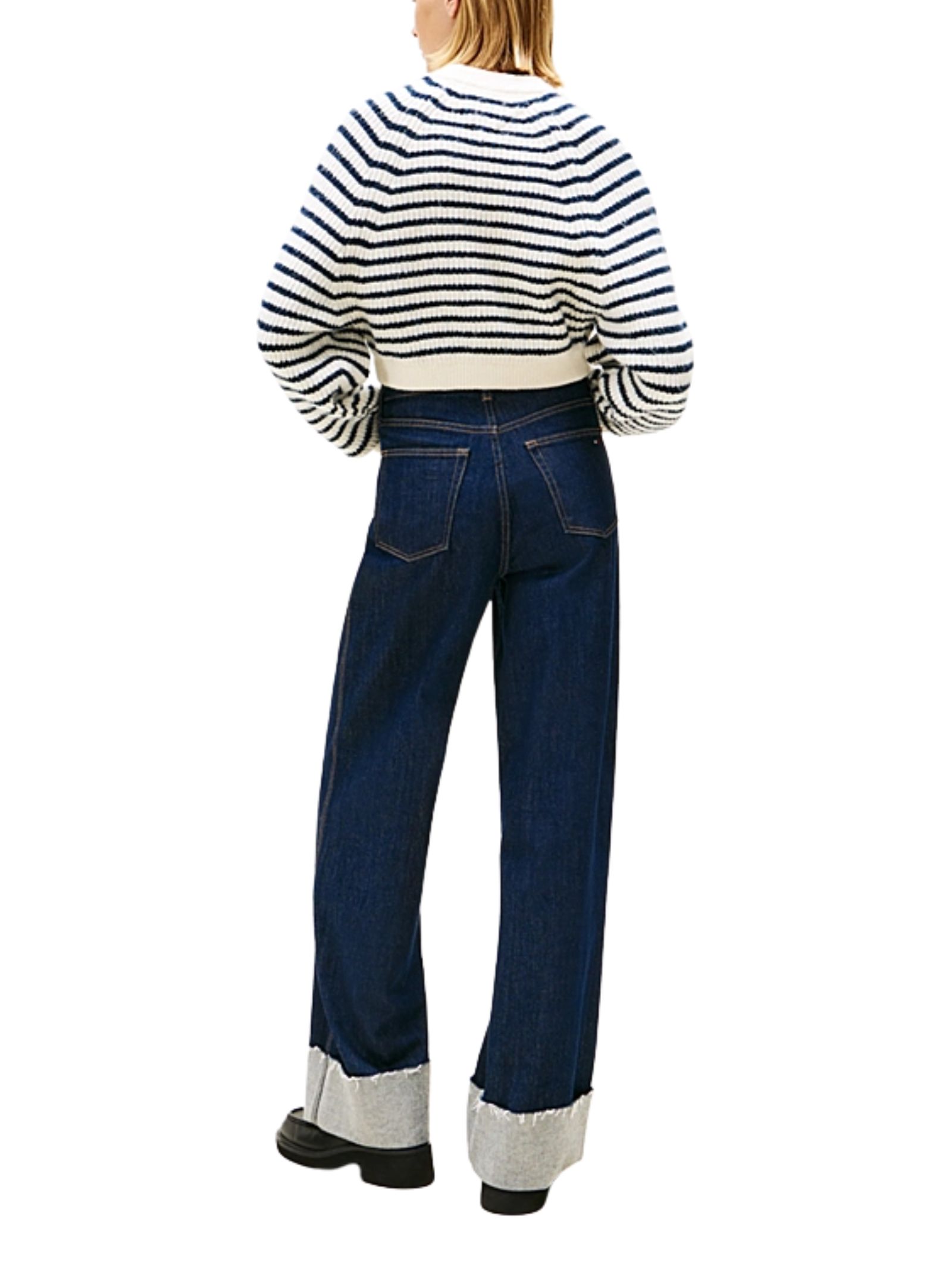 Pullover a righe bianco e blu Tommy Jeans a vestibilità squadrata, realizzato in maglia in misto lana per un tocco di raffinatezza, con scollatura rotonda, collo, polsini e fondo a coste, distintivo Tommy sul petto e branding. Spalle leggermente scese. Composizione: 53% poliestere, 38% nylon, 9% lana.