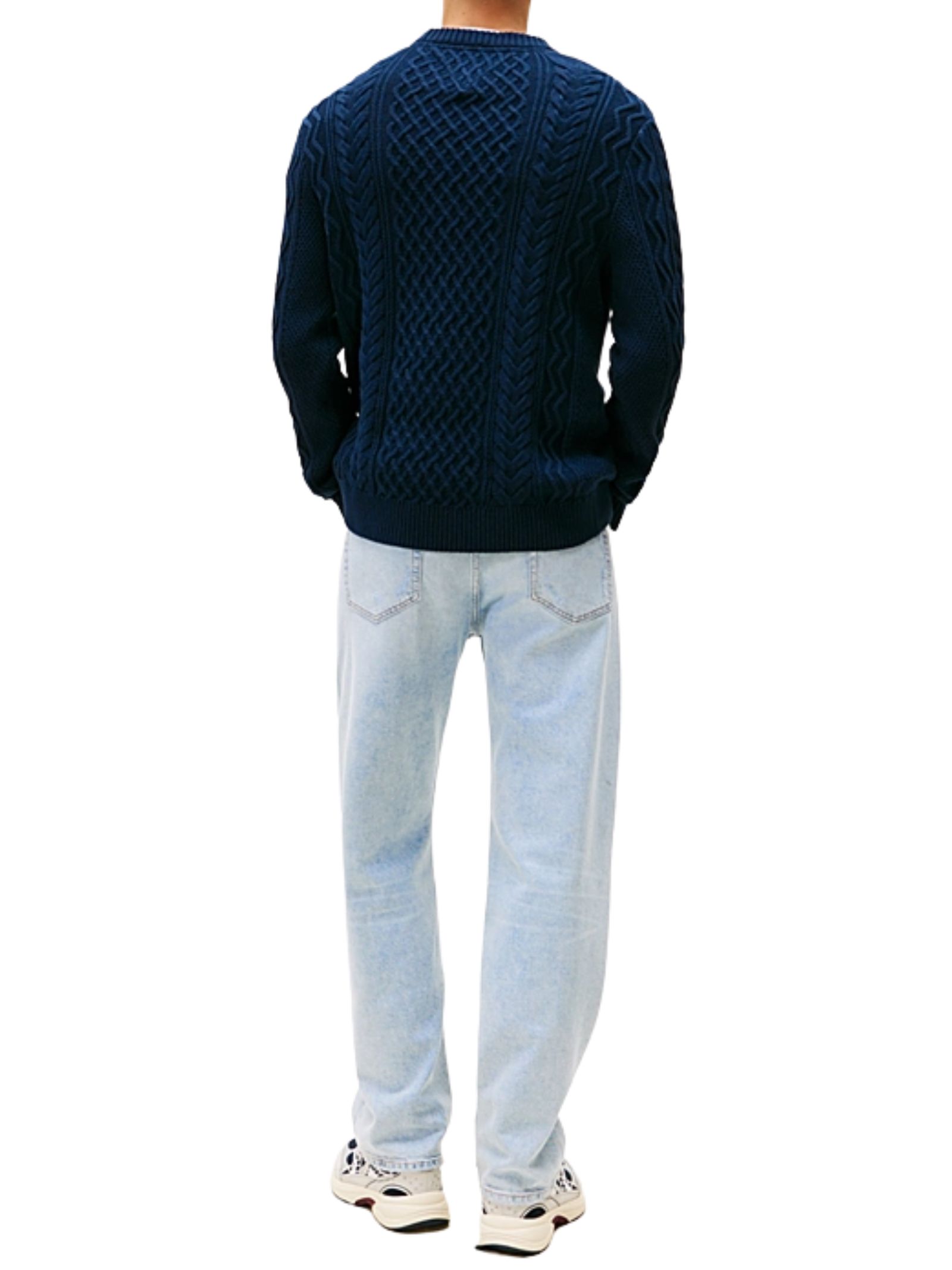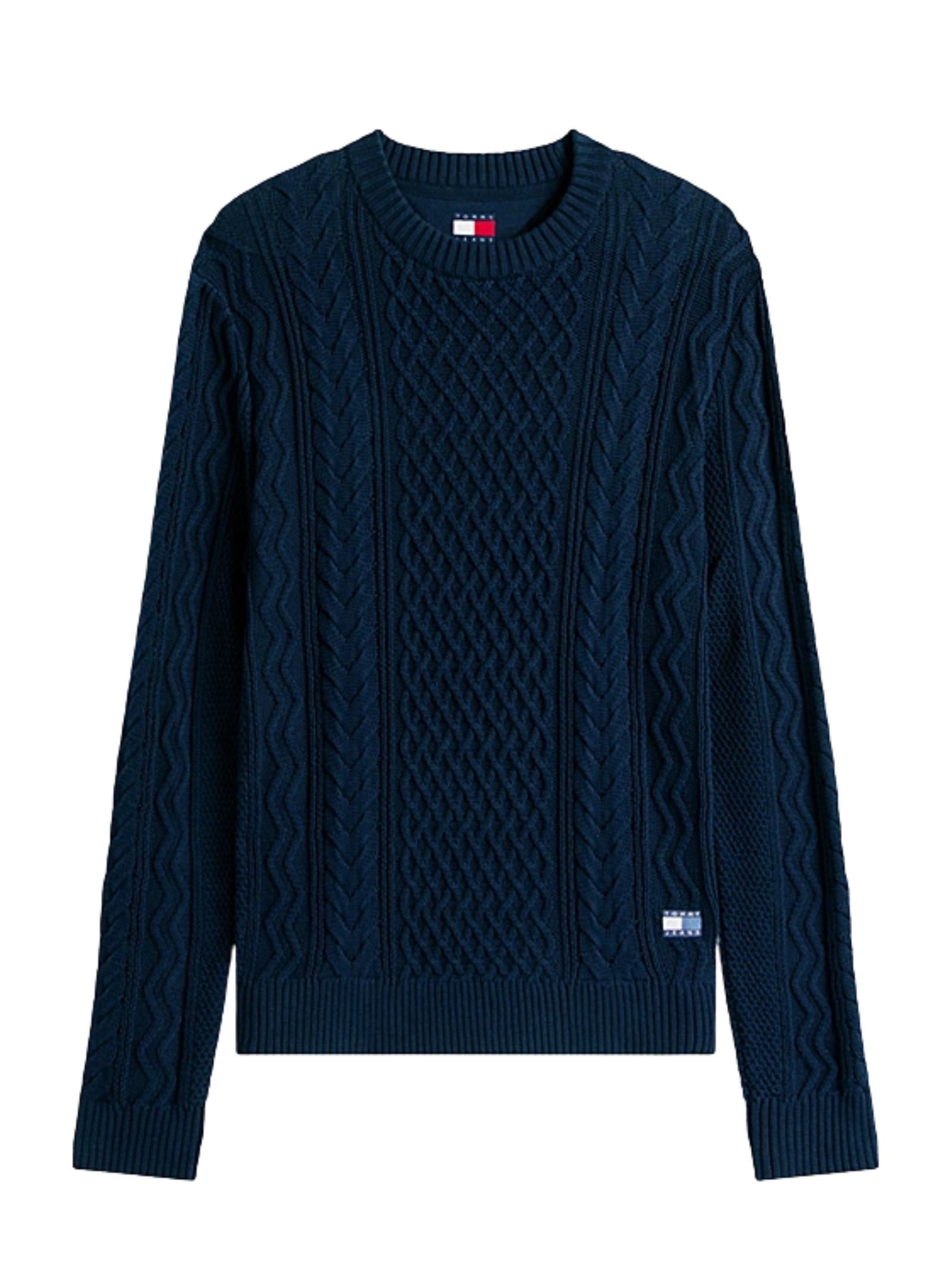 Pullover blu Tommy Jeans realizzato in puro cotone con classica lavorazione a maglia intrecciata e taglio slim, un capo intramontabile e di grande impatto. Presenta girocollo, collo, polsini e fondo a coste, distintivo Tommy tono su tono sul fondo e branding Tommy Jeans. Vestibilità slim. Composizione: 100% cotone.
