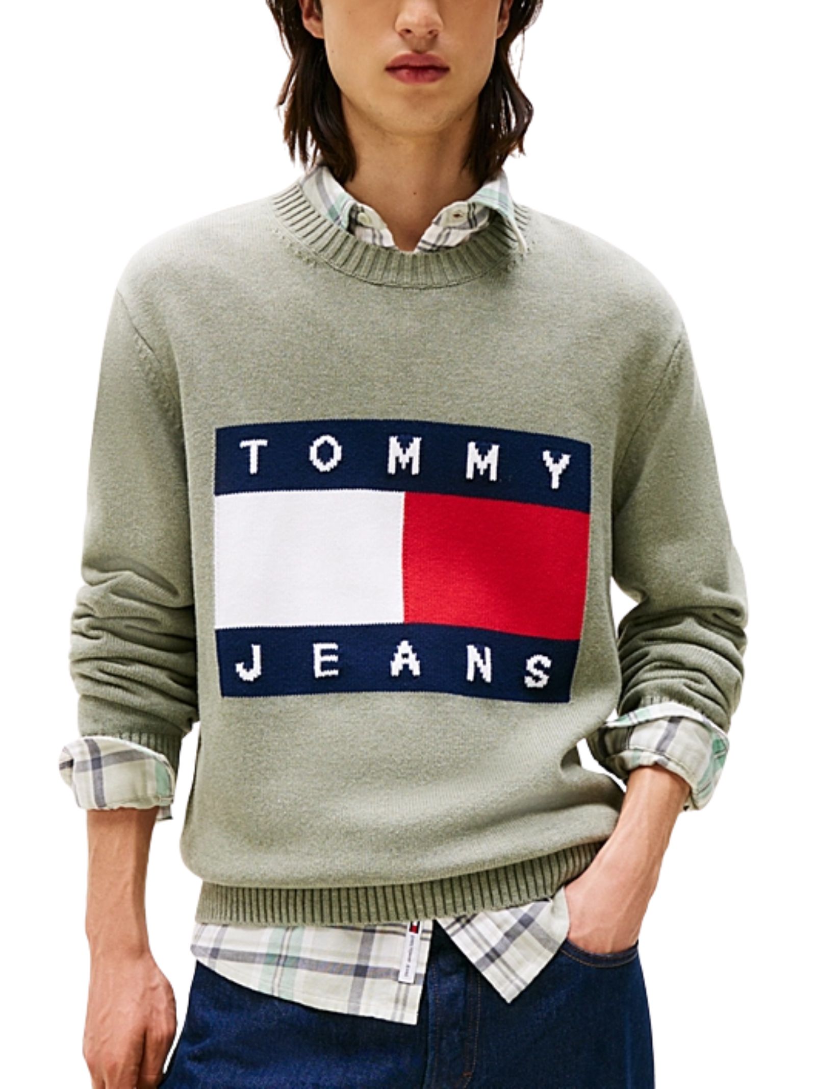 Pullover verde Tommy Jeans in puro cotone pettinato mélange, con girocollo, collo, polsini e fondo a coste, e distintivo con bandiera Tommy a intarsio sul petto. Vestibilità regular. Composizione: 100% cotone.