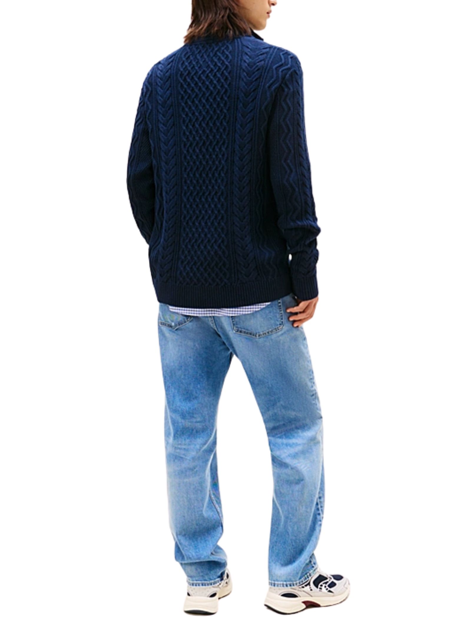 Pullover blu in maglia intrecciata in puro cotone con collo a lupetto e mezza zip, dal taglio slim fit che unisce stile heritage e ispirazione sportiva; finiture a coste su collo, polsini e fondo, distintivo Tommy tono su tono sul petto e branding Tommy Jeans; 100% cotone.