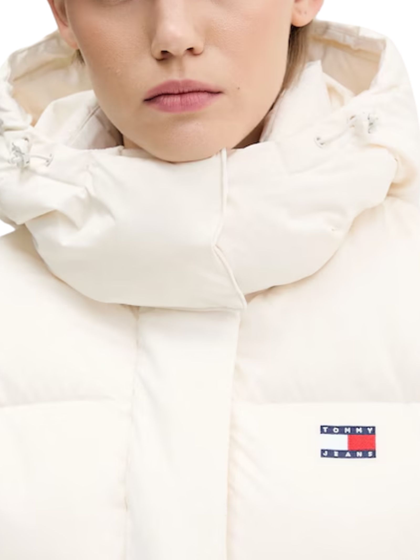 Giacca Tommy Jeans in tessuto tinta unita trapuntato con imbottitura in piuma e piumino naturale per un elevato isolamento termico. Presenta una finitura idrorepellente che protegge da pioggia e vento garantendo comfort e resistenza allacqua. Il taglio ampio assicura libertà di movimento, con colletto rialzato e cappuccio staccabile e regolabile. Spalle abbassate, polsini elastici e laccetti al fondo migliorano vestibilità e isolamento. Dotata di due tasche laterali con zip, una tasca interna e chiusura frontale con zip lunga e patta con bottoni automatici.