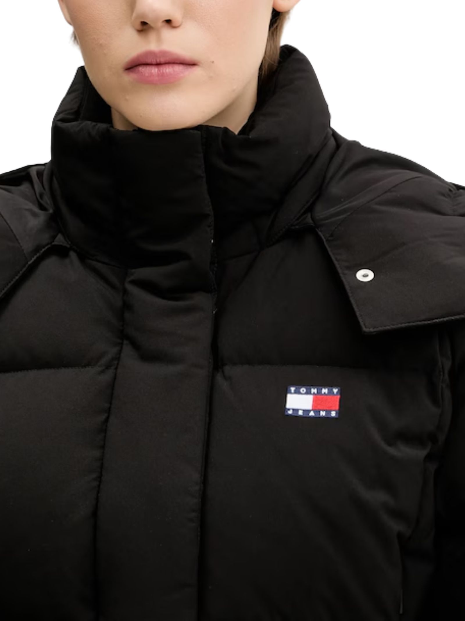 Giacca Tommy Jeans in tessuto tinta unita trapuntato con imbottitura in piuma e piumino naturale per un elevato isolamento termico. Presenta una finitura idrorepellente che protegge da pioggia e vento garantendo comfort e resistenza allacqua. Il taglio ampio assicura libertà di movimento, con colletto rialzato e cappuccio staccabile e regolabile. Spalle abbassate, polsini elastici e laccetti al fondo migliorano vestibilità e isolamento. Dotata di due tasche laterali con zip, una tasca interna e chiusura frontale con zip lunga e patta con bottoni automatici.