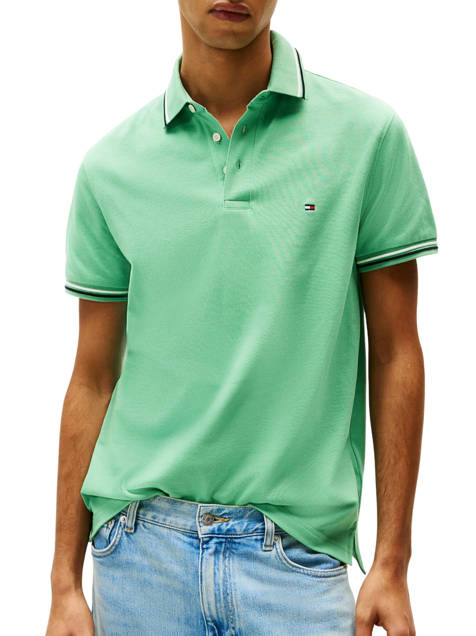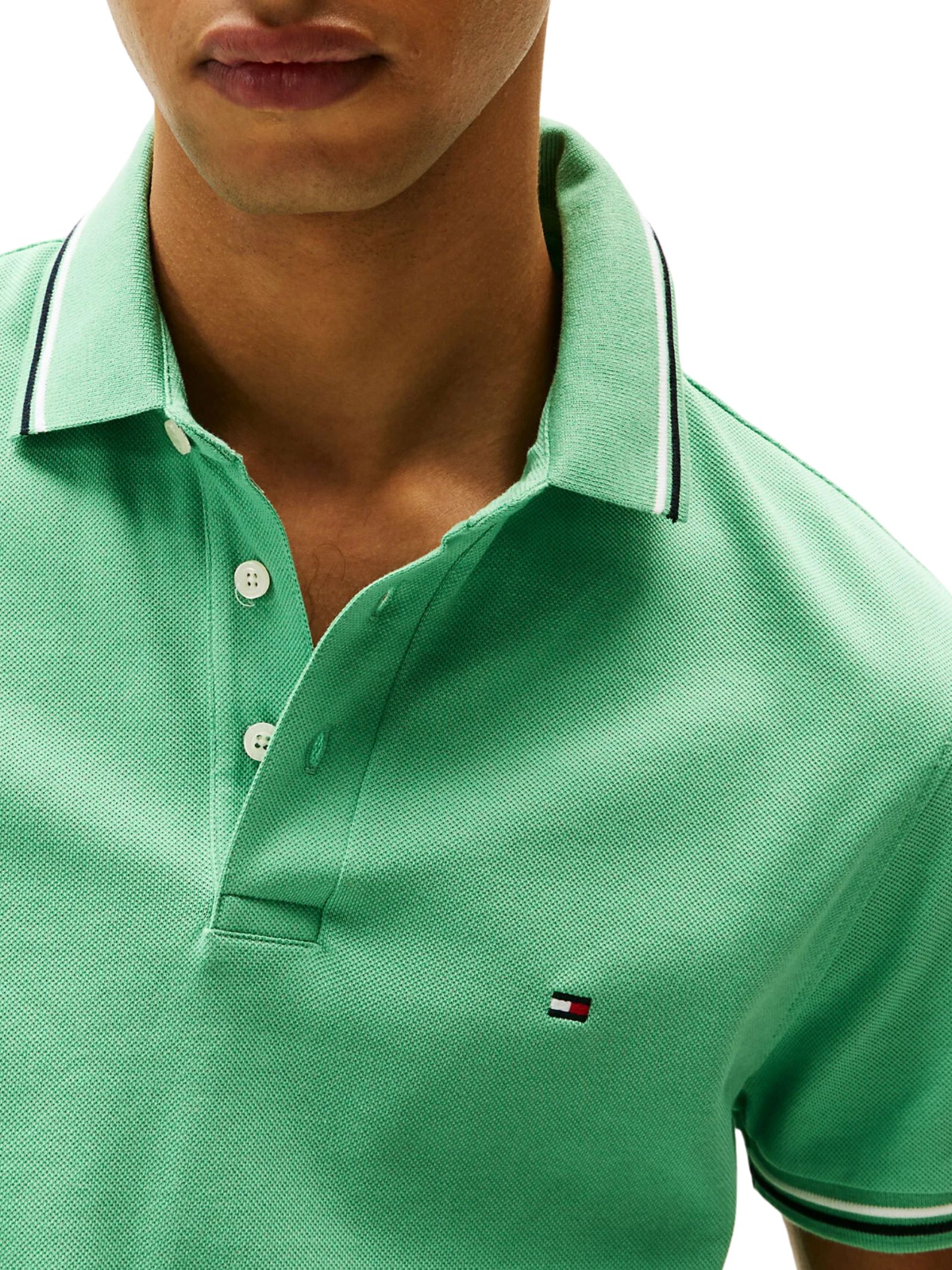 Polo in jersey di puro cotone, arricchita da dettagli sportivi e finiture a contrasto; colletto e polsini distintivi, abbottonatura a due bottoncini e orlo asimmetrico, con logo Tommy Jeans e iconica bandierina ricamata sul petto.