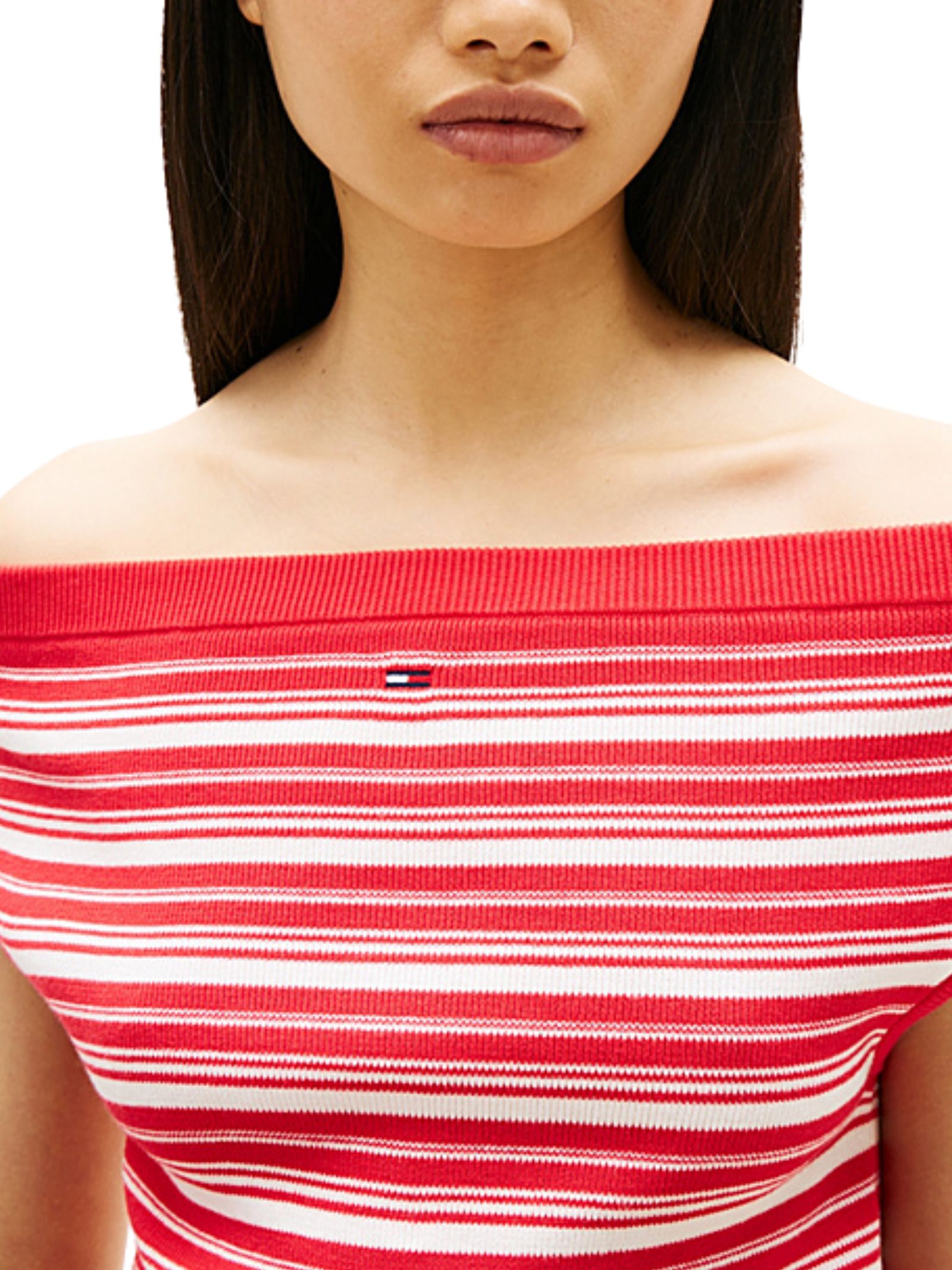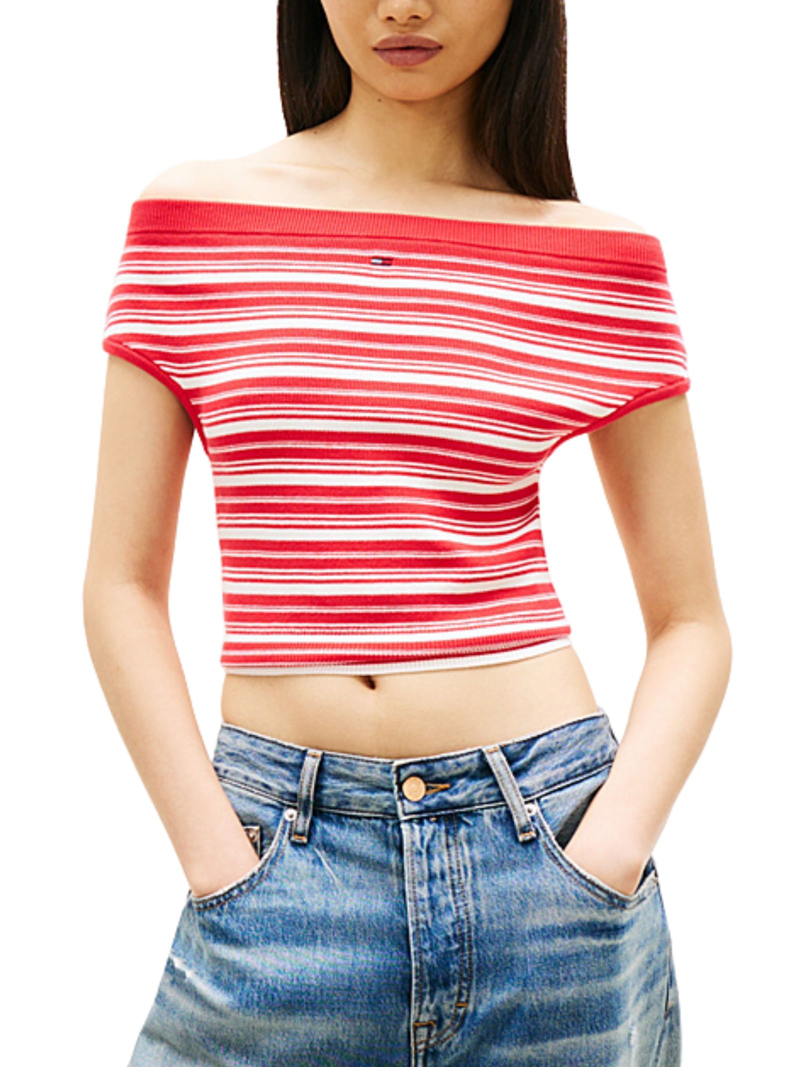 Pullover a righe in puro cotone d'ispirazione marinara, con design a spalle scoperte e vestibilità slim fit. Rifinito con fondo a coste e iconico ricamo Tommy sul davanti.
