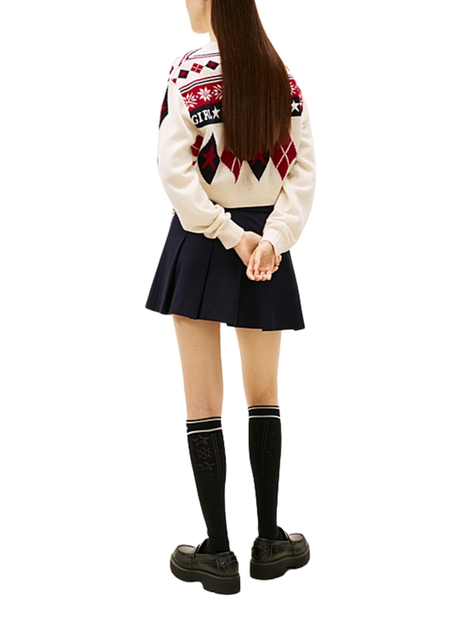 Pullover Tommy Girl dal design squadrato che unisce spirito anni Novanta e stile contemporaneo, realizzato in pura lana con motivo Fair Isle all over, caratterizzato da girocollo, collo, polsini e fondo a coste, spalle scese e vestibilità squadrata, impreziosito da iconico logo Tommy Girl a intarsio ripetuto sul petto e branding Tommy Girl, composizione 100% lana.