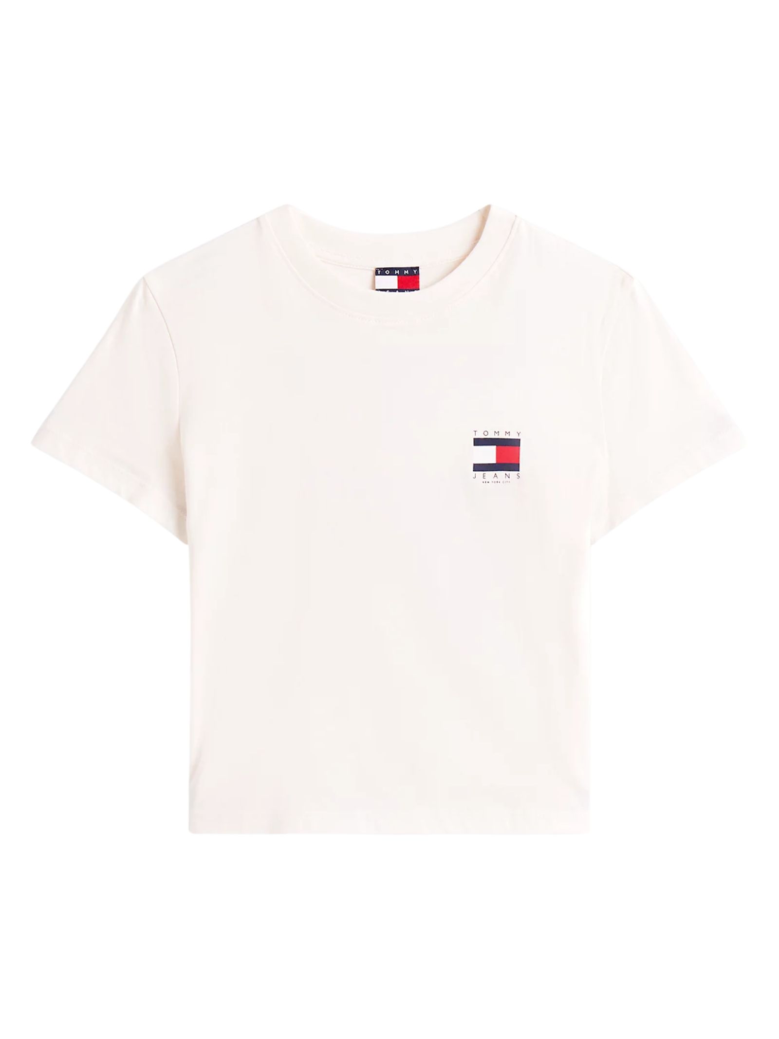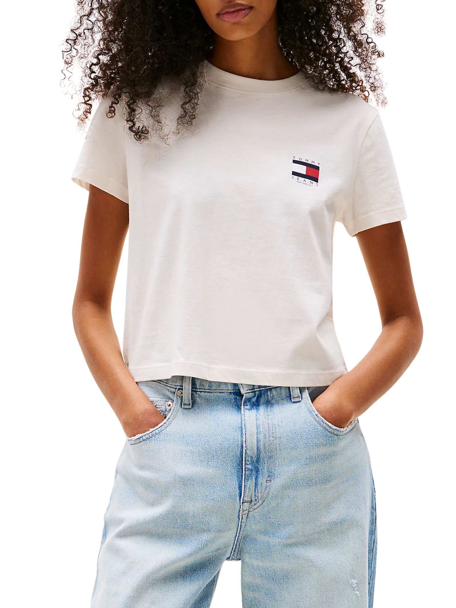 T shirt Tommy Jeans con Logo piccolo sul petto e logo più grande dietro la schiena. vestibilità crop e regolare. 100%cotone